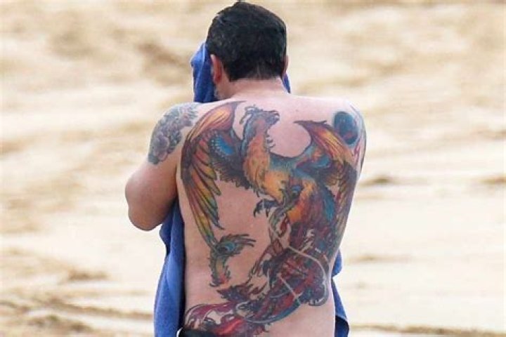 Ben Affleck's large back tattoo is a vibrant and intricate phoenix rising from the ashes, inked by renowned tattoo artist Scott Campbell. The tattoo holds deep personal meaning for Affleck, symbolizing his journey of overcoming adversity and personal struggles.